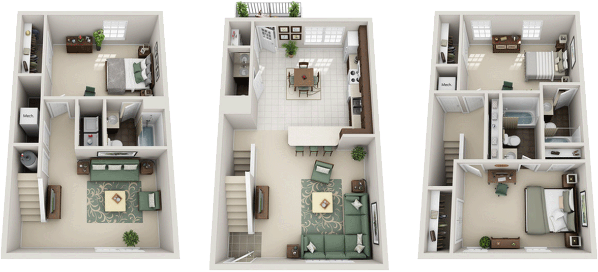 Our 3-bedroom, 3.5-bathroom townhomes are designed to give you the privacy you want and the convenience you need for student living. Each resident enjoys a private bedroom, private bathroom, and walk-in closet, while shared spaces feature a fully furnished living area, modern furniture, and an upgraded kitchen with a full-size pantry in select homes. With no bedrooms on the first floor, these townhomes offer an added layer of privacy, plus the convenience of an entry-level guest bath, in-home washer and dryer, included Wi-Fi, and a monthly electric allowance. Select townhomes also feature a shared back deck, giving you the perfect space to relax and recharge between classes.
